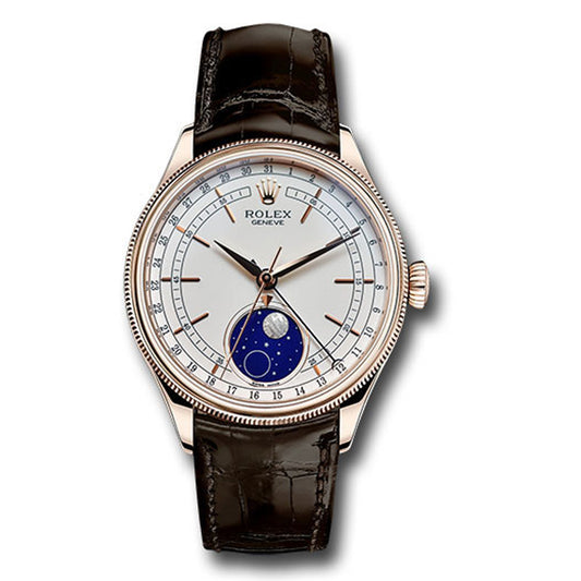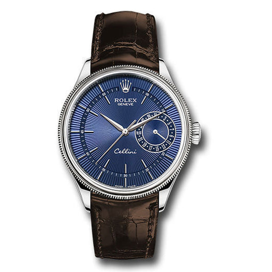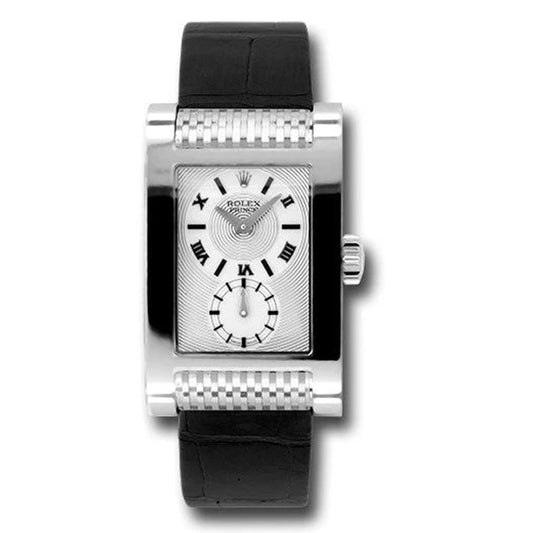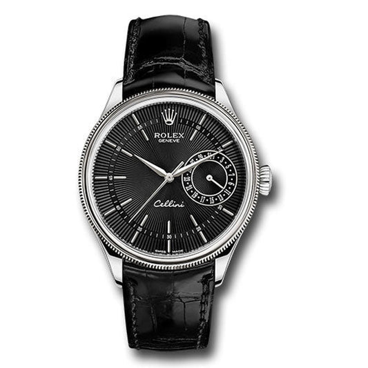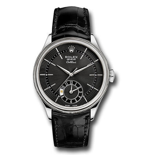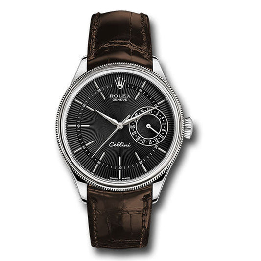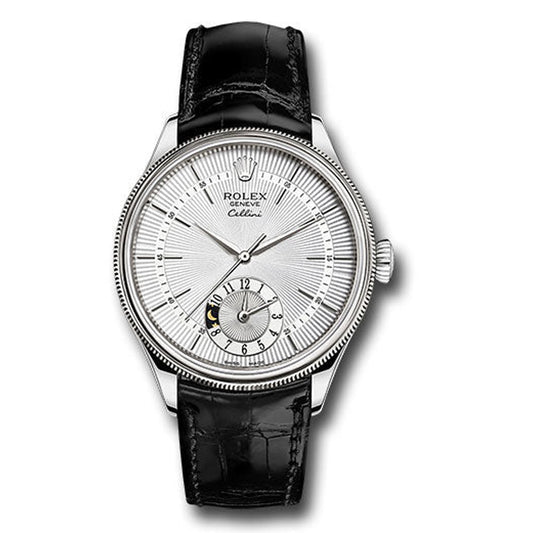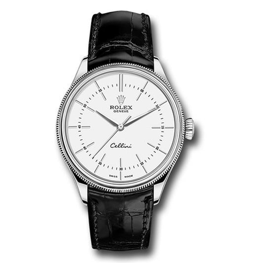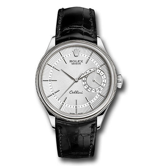 39mm 18K white gold case, flared screw-down crown with Rolex emblem, double domed and fluted...