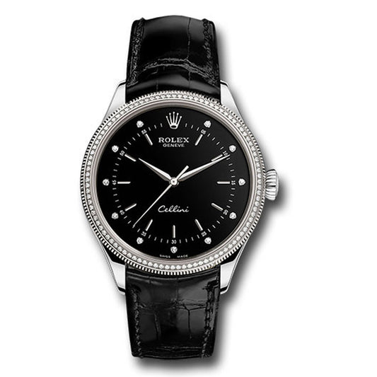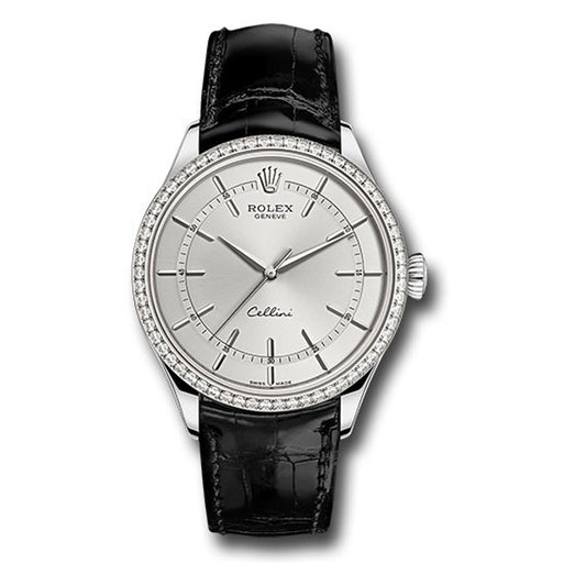 39mm 18K white gold case, flared screw-down crown with Rolex emblem, bezel set with 96...