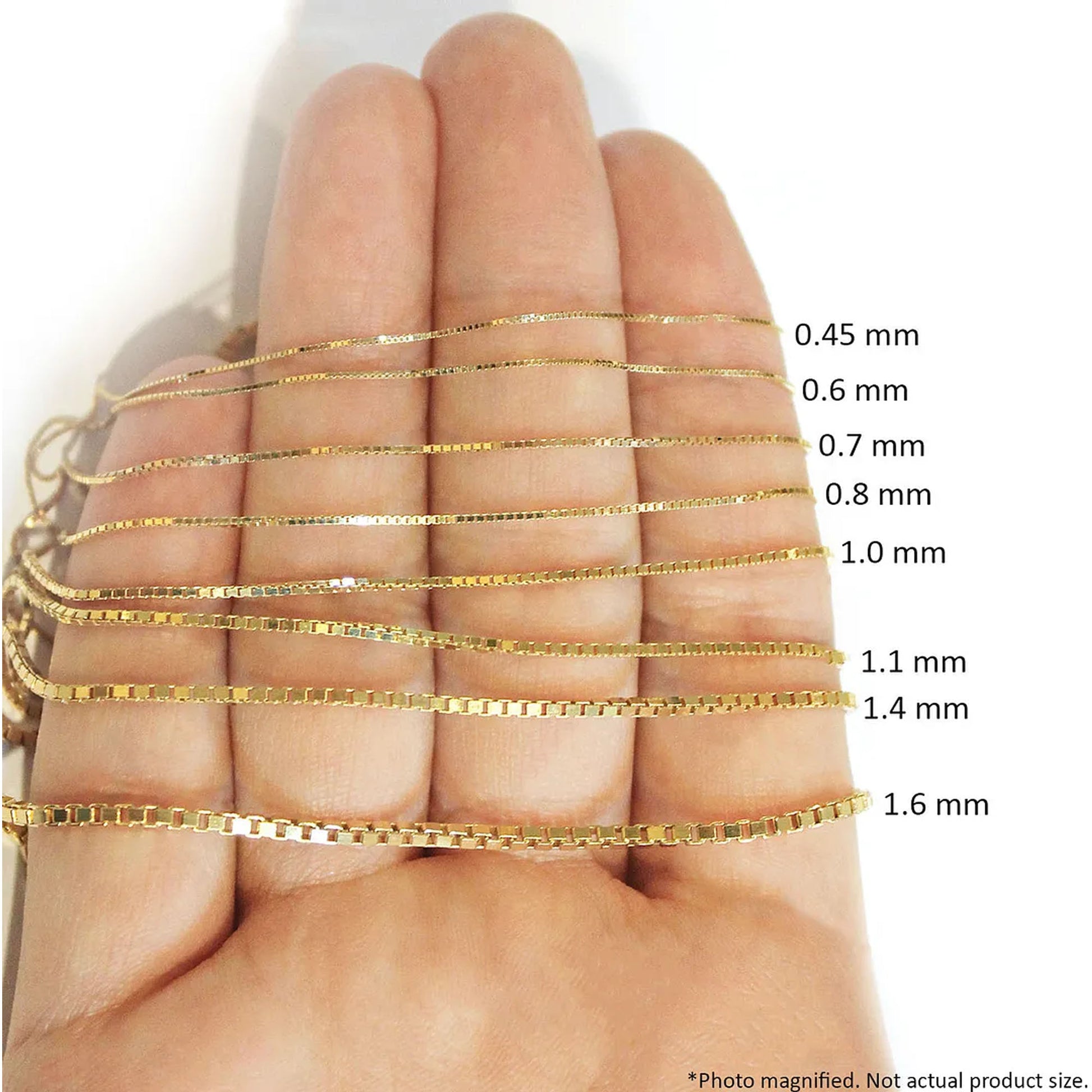 Crafted from solid 14K yellow gold, the 0.60 mm classic box chain is a testament to both luxury and durability. The chain's classic box design not only enhances its strength but also ensures a smooth, polished surface that glimmers with every movement, catching the light from all angles. This radiant shine adds a subtle yet captivating sparkle, making it an ideal choice for both everyday wear and special occasions.
